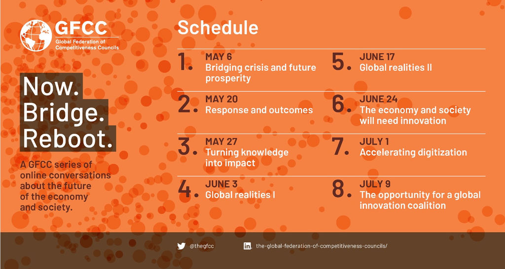 May 4 1 min Now. Bridge. Reboot. conversation series The world has changed and the GFCC is mobilizing its global network of members and fellows across 30+ countries to (i) share experiences ...